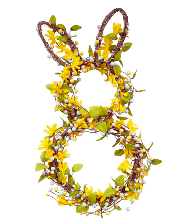 This 28 inch design is one of the most eye catching easter bunny wreaths for spring decor. It features a bunny shape made with natural branches, decorated with yellow flowers, colorful eggs, and small berries. The warm tones create a cozy and happy look that fits farmhouse, rustic, or modern homes. You can hang it on your front door, window, or even indoors to create a strong seasonal statement.